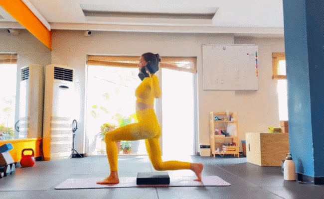 Động tác thứ 2, Hồ Ngọc hà kết hợp lunges và dumbbell shoulder press (đẩy tạ vai). Đây là động tác phức hợp khá khó, người mới tập có thể sẽ hơi khó để bắt chước. Bạn có thể thực hiện cầm chai nước tập riêng lẻ từng động tác.