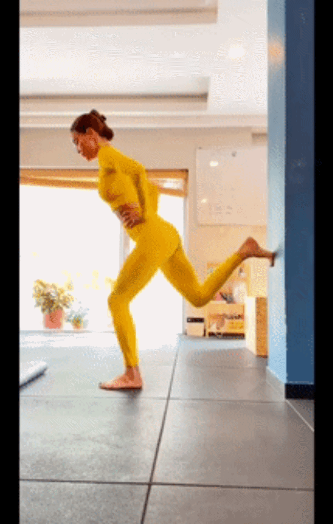 Chưa hết, Hồ Ngọc Hà tiếp tục pump (bơm) vòng 3 tiếp theo đó bằng động tác biến thể của split squat. Cô chống 1 chân lên tường để kích thích vào mông đùi nhiều hơn. Bạn cũng có thể kê 1 chân lên bục/ghế dài để thay thế. Dễ hơn bạn có thể đặt 2 chân xuống đất và hạ trọng tâm.