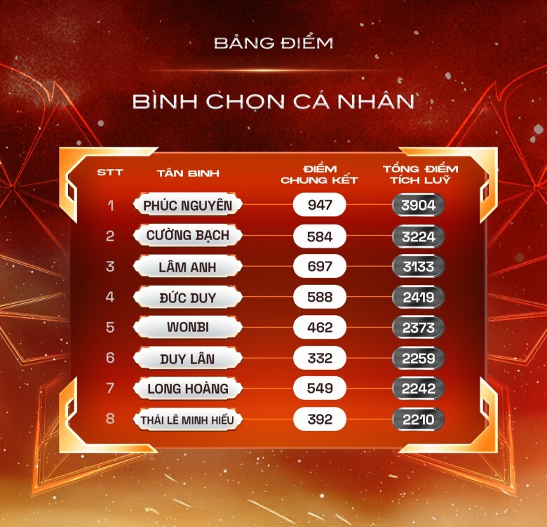 Trong khi đó, Phúc Nguyên - thành viên có điểm tích lũy cao nhất bày tỏ: “Đây mới là điểm bắt đầu thôi... Phúc Nguyên sẽ luôn luôn nhắc cho mình là phải luôn có mục tiêu trong người và sẽ chứng minh cho mọi người thấy là mọi người sẽ tự hào về Phúc Nguyên”.