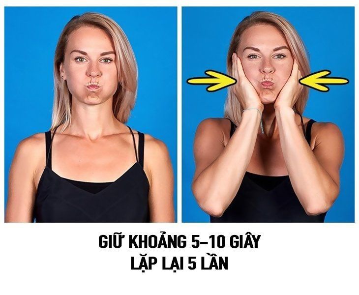 Bài tập phồng má hỗ trợ đắc lực cải thiện vùng cằm V-line, tiêu mỡ cằm. Bạn hít một hơi thật sâu và giữ không khí trong má, sau đó đẩy sang má khác. Làm điều này nhiều lần trong ngày. Bài tập này giúp bạn có nhiều chuyển động trên khuôn mặt đặc biệt là ở cổ và má giúp đánh tan mỡ nhanh chóng hơn.