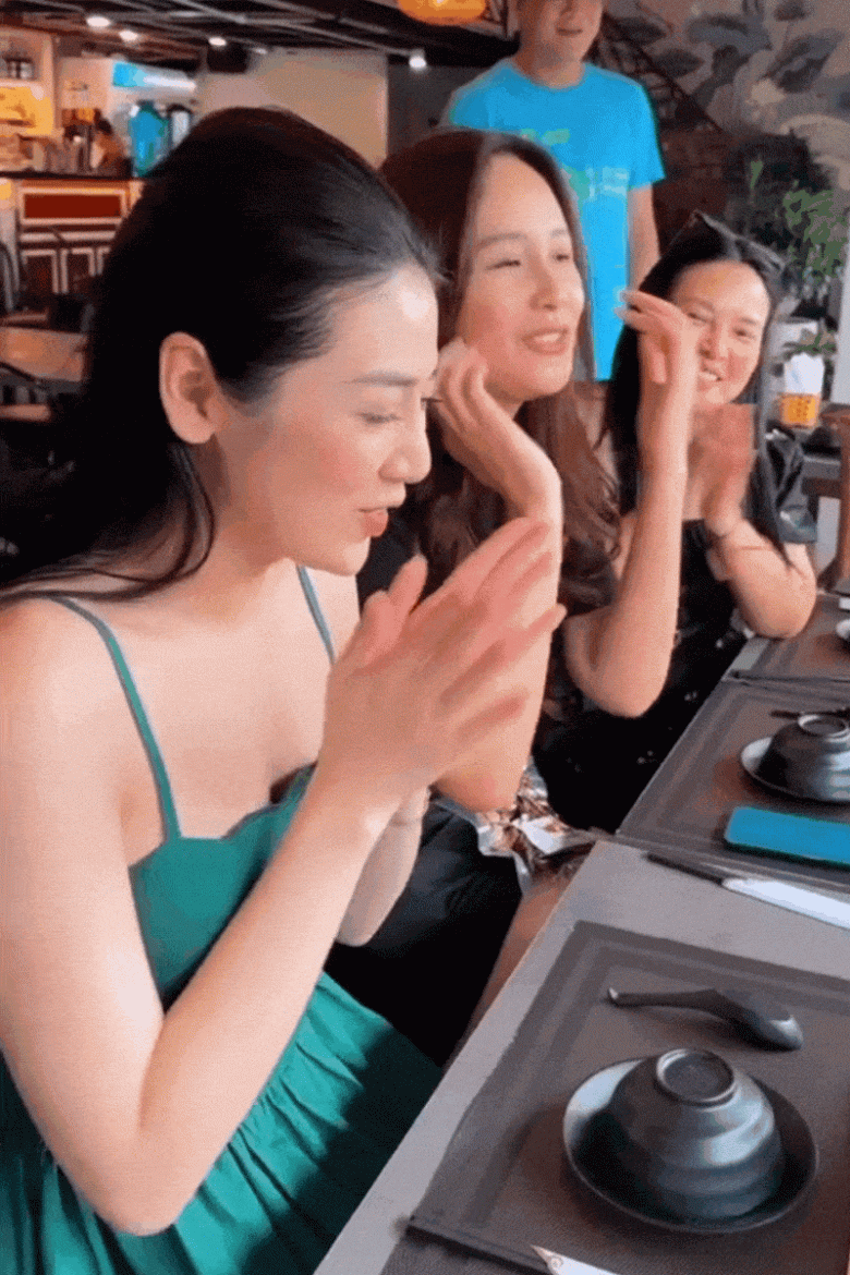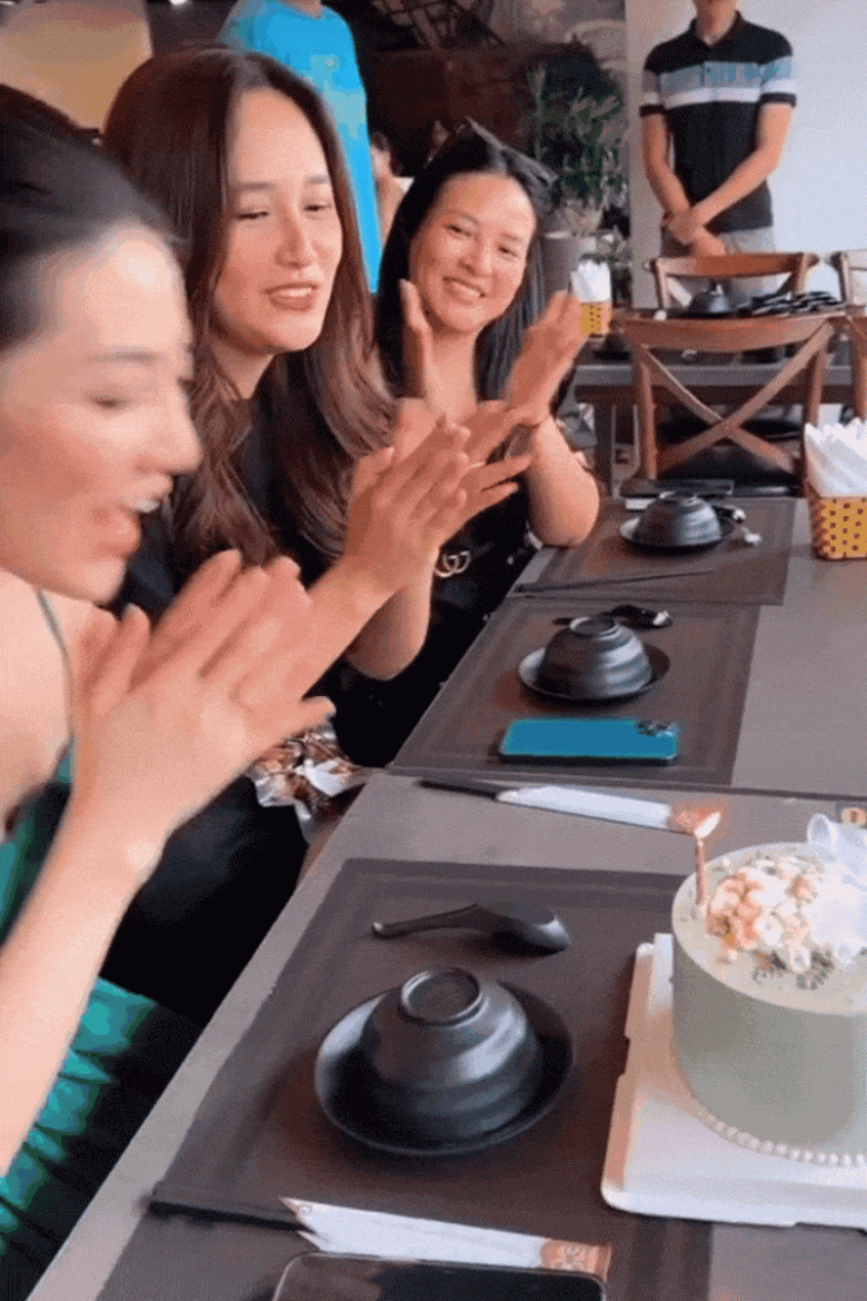 Chủ nhân bữa tiệc là Á hậu Dương Tú Anh nổi bật với chiếc đầm xanh, làn da trắng ngần. Mai Phương Thuý xuất hiện ở đằng sau với trang phục màu đen giản dị.