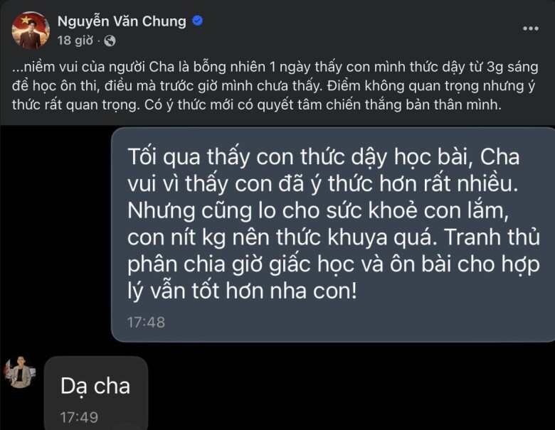 “Niềm vui của người cha là bỗng nhiên 1 ngày thấy con mình thức dậy từ 3 giờ sáng để học ôn thi, điều mà trước giờ mình chưa thấy. Điểm không quan trọng nhưng ý thức rất quan trọng. Có ý thức mới có quyết tâm chiến thắng bản thân mình” - nam nhạc sĩ viết.