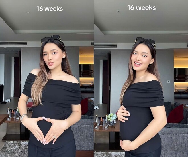 Bên cạnh đó, một số chị em đặt nghi vấn nữ người mẫu đang mang song thai, bởi chiếc bụng của cô được nhận xét khá to tròn so với tuổi thai hiện tại là 4 tháng. Trước nghi vấn này, người đẹp vẫn giữ thái độ nhẹ nhàng, không xác nhận hay phản hồi.