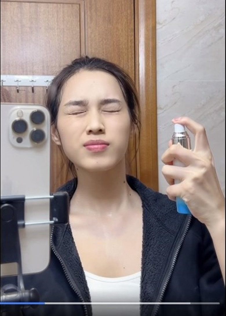 Một điểm nhấn khá thú vị trong chu trình skincare của Đỗ Thị Hà đó là sau khi rửa mặt, cô xịt toner dưỡng ẩm tạm thời và sau đó đi tắm. Hầu hết mọi người thường không nghĩ tới điều này mà rửa mặt xong là sẽ tắm luôn. Đỗ Thị Hà cho rằng, sau khi rửa mặt thì da sẽ có cảm giác hơi căng, khô. Do đó, rất cần thiết để cấp ẩm ngay và luôn.