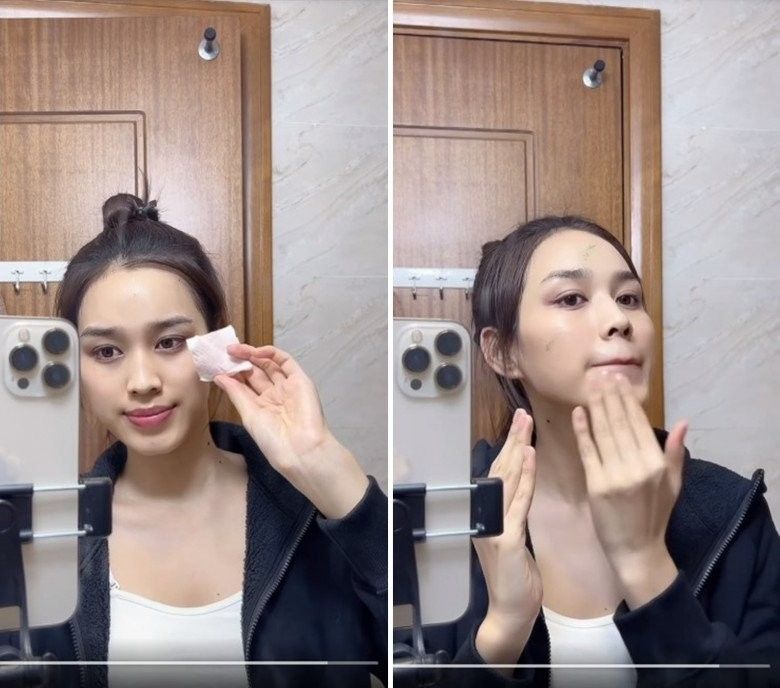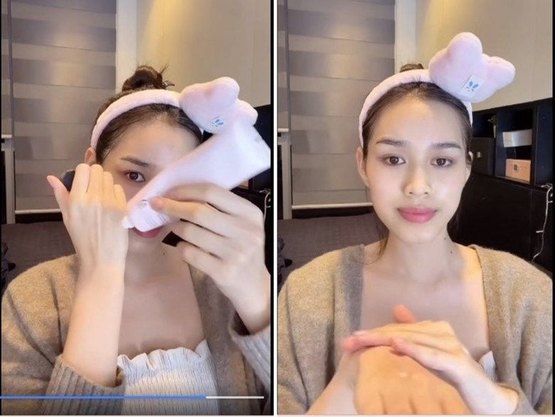Bước đầu tiên của cô luôn là tẩy trang. Vì gương mặt của cô ngày thường chỉ thoa kem chống nắng và đánh son nhẹ nên cô chỉ sử dụng nước tẩy trang dịu nhẹ tới từ thương hiệu mỹ phẩm dịu dàng với làn da nhạy cảm. Điều bất ngờ lại nằm ở bước thứ 2 liền kề sau đó. Cô tiến hành tẩy da chết vật lý với sản phẩm có hạt. Chân dài cũng bộc bạch đã kinh qua nhiều sản phẩm tẩy da chết nhưng cuối cùng dừng lại với sản phẩm có chứa thành phần hạt. Cô cũng lưu ý dòng hạt tẩy tế bào chết khá lớn nên có thể không phù hợp với da mụn hay da nhạy cảm.