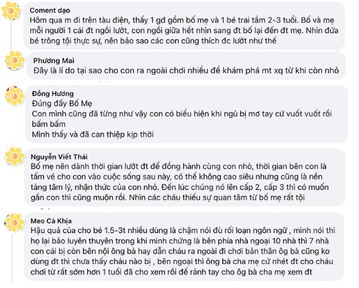 Bên dưới bài đăng, cõi mạng để lại vô số bình luận tranh cãi. Không ít ông bố bà mẹ bày tỏ sự bất lực, buồn bực vì đâu đó họ cũng thấy bóng dáng con cái mình trong đó. Vì bận rộn công việc, vì nuông chiều con hay vì không dành sự quan tâm sát sao cho con, mà nhiều gia đình cho con tiếp xúc với thiết bị điện tử như điện thoại, ipad từ sớm, thậm chí còn khiến đứa trẻ “bị nghiện”.