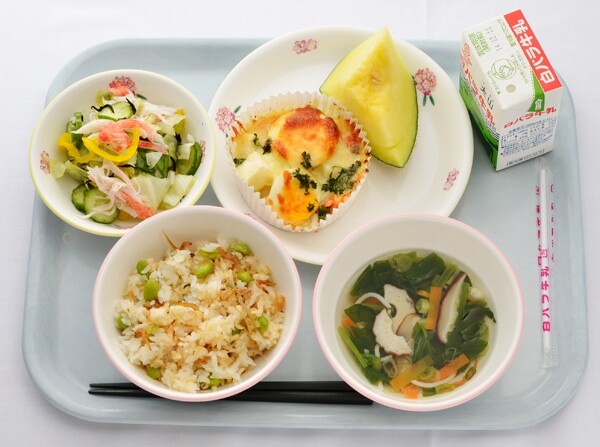 Món cơm hiếm khi chỉ là cơm trắng mà sẽ được thêm nấm hoặc tảo bẹ wakame hoặc đổi thành cơm rang hoặc cơm thập cẩm. Bánh mì ngọt xuất hiện trong bữa trưa khoảng 1 lần/tháng. Món tráng miệng được phục vụ 1-2 lần/tuần, là một phần trái cây hoặc thạch hoặc bánh pudding.