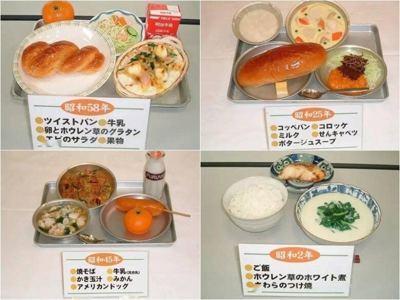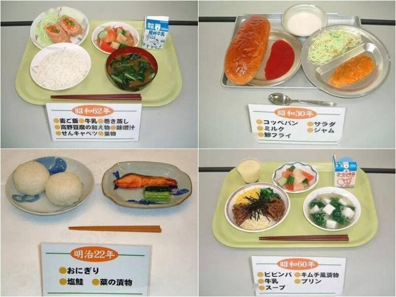 Ngày từ những năm trước năm 1987, học sinh tại Nhật Bản đã được cung cấp những bữa trưa dinh dưỡng như thế này, bao gồm toàn các món ngon, giá trị dinh dưỡng cao như cá hồi, súp, cơm trộn, trứng nướng với rau bina, salad tôm, mì xào, sữa, súp trứng hàu, quýt, xúc xích...