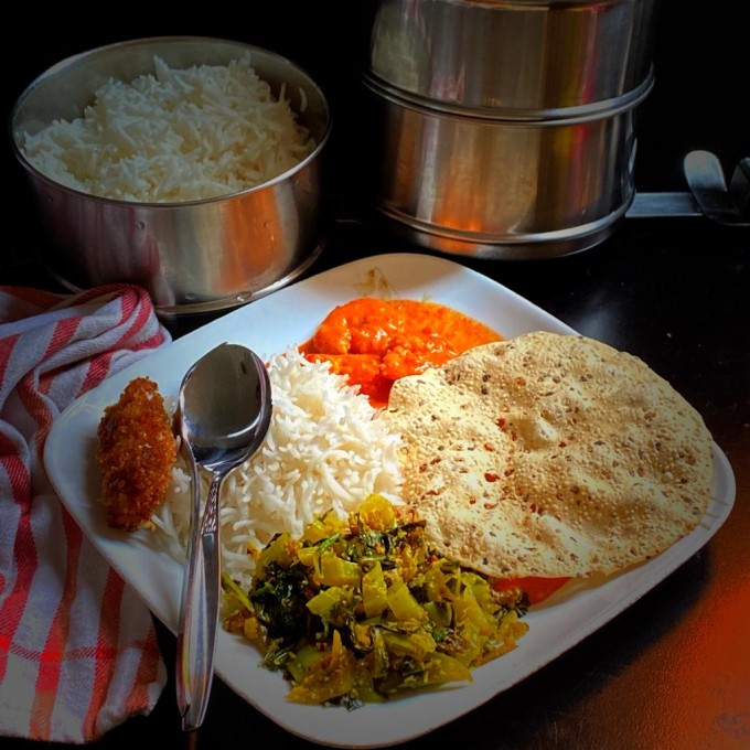 Bữa trưa với cơm gà, súp trứng với rau và salad trái cây.