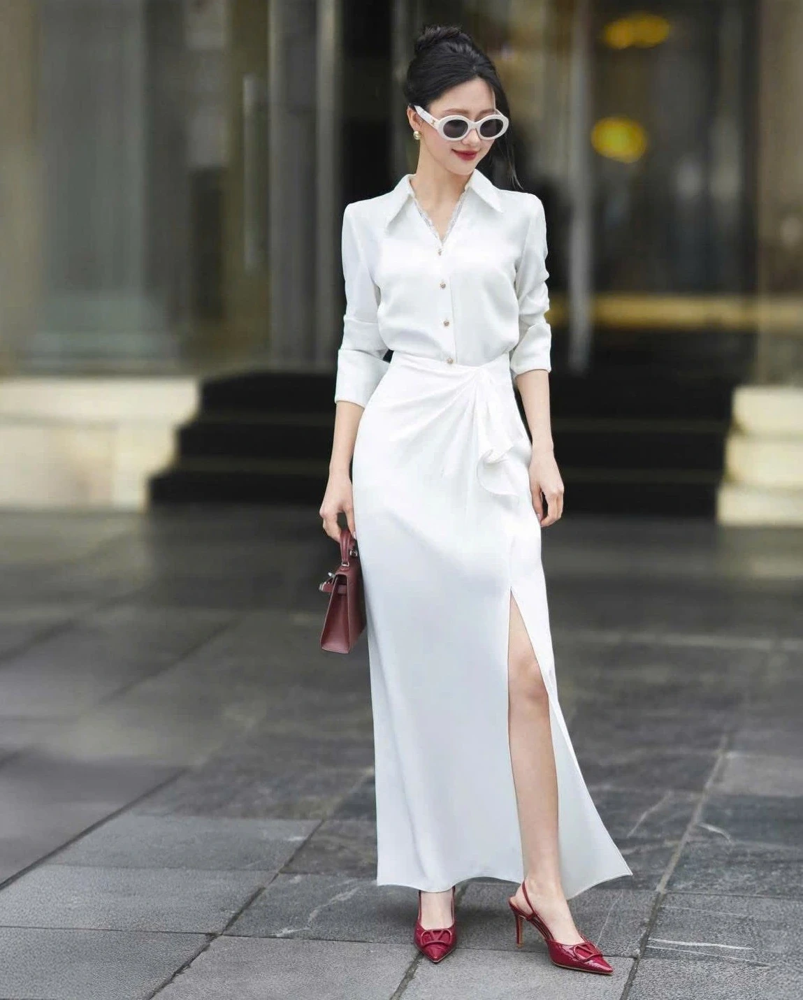 Để áp dụng cách phối này, bạn có thể chọn một set áo và chân váy đồng bộ hoặc linh hoạt kết hợp hai món đồ riêng có màu sắc tương đồng. Nhìn từ xa, outfit sẽ giống như một chiếc váy liền thân thanh lịch, vừa thời trang vừa hạn chế cảm giác “đụng hàng”.