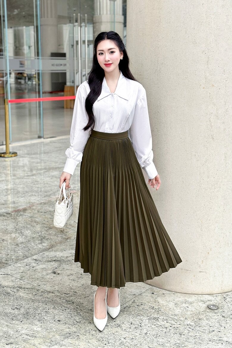 Khi kết hợp cùng áo sơ mi, chân váy xếp ly mang đến sự cân bằng hoàn hảo giữa nét thanh lịch và vẻ dịu dàng. Một bên là sự chỉn chu, trang trọng của áo sơ mi; một bên là vẻ mềm mại, lãng mạn của chân váy xếp ly. Bộ đôi này tạo nên hình ảnh nữ tính nhưng vẫn hiện đại, rất phù hợp với những cô nàng yêu phong cách Hàn Quốc hoặc thanh lịch kiểu Pháp.
