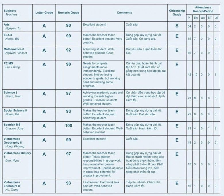 Bảng điểm học kì 1 của Thiên Nga rất xuất sắc.