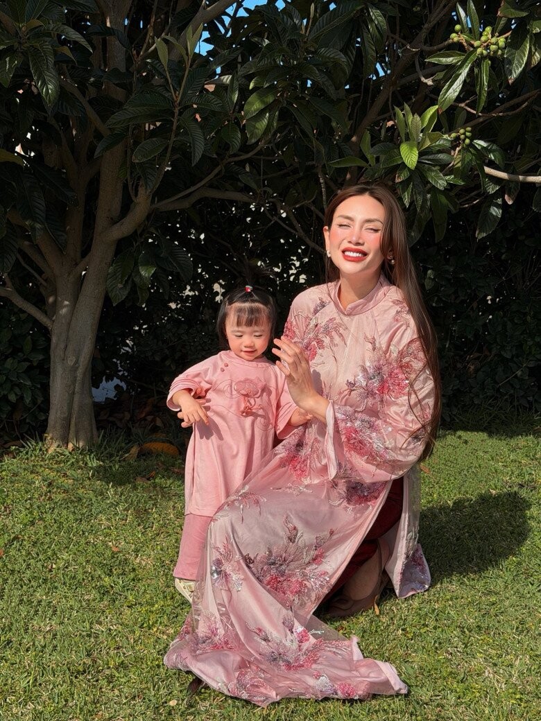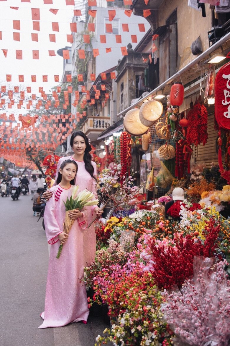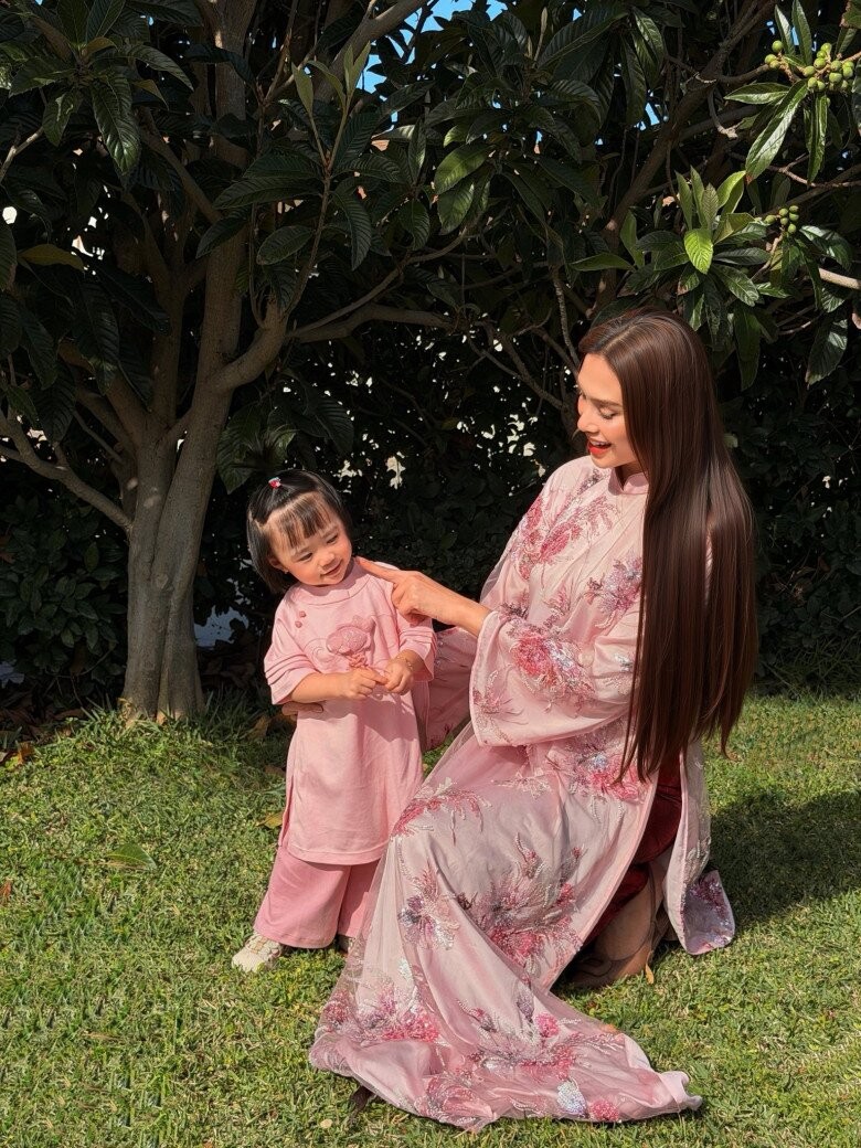 Năm nay con gái Viann đã lớn nhiều, Hoa hậu Hà Kiều Anh chuẩn bị bộ áo dài đồng điệu với con gái để cùng bé ra phố chụp ảnh.
