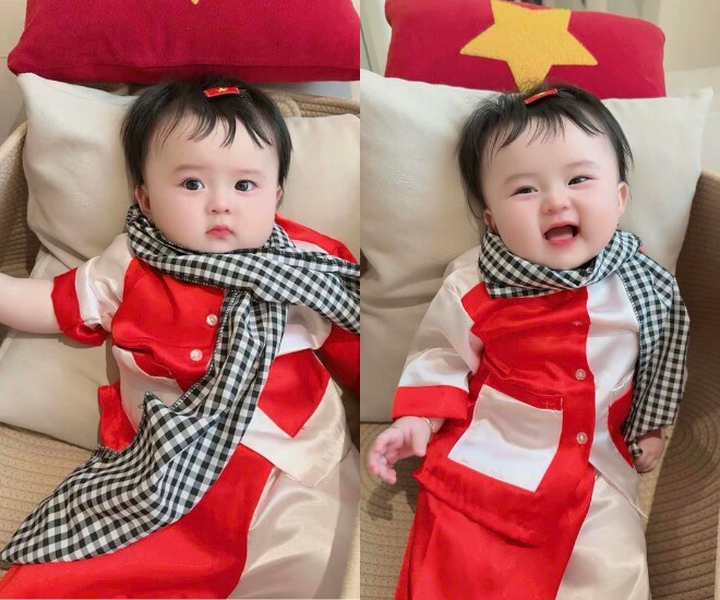 Con gái Hoa hậu Phương Lê và NSƯT Vũ Luân hóa thân thành cô giao liên nhí vào dịp lễ.
