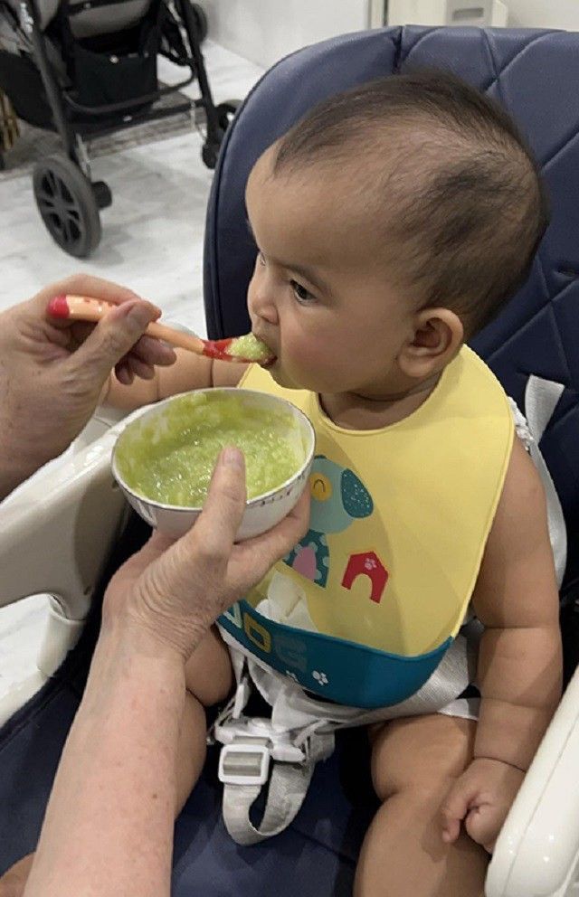 Được mẹ cho ăn cháo nấu từ gạo, gạo lứt, gạo - đậu lăng, gạo - đậu gà,... kết hợp với rau củ xay, kèm bột, bánh ăn dặm nên Moon vẫn phát triển tốt, thậm chí vượt luôn cả tiêu chuẩn thông thường.