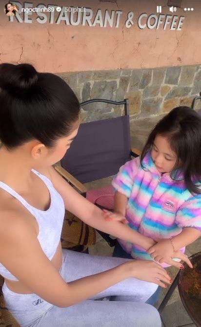 Hình ảnh hai mẹ con chăm sóc lẫn nhau trong suốt chuyến đi được người đẹp cập nhật thường xuyên trên dòng story.