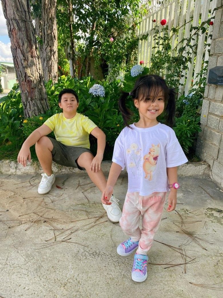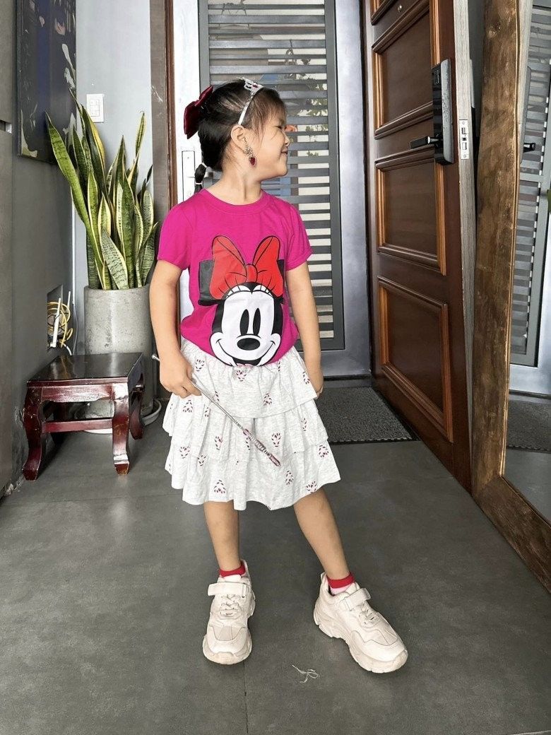 Lê Phương thường chọn cho con những trang phục phù hợp với lứa tuổi. Thông thường là những chiếc chân váy điệu đà kết hợp cùng áo phông năng động, thoải mái. Bà mẹ 2 con cũng thường cho con mang giày thể thao để dễ dàng chạy nhảy.