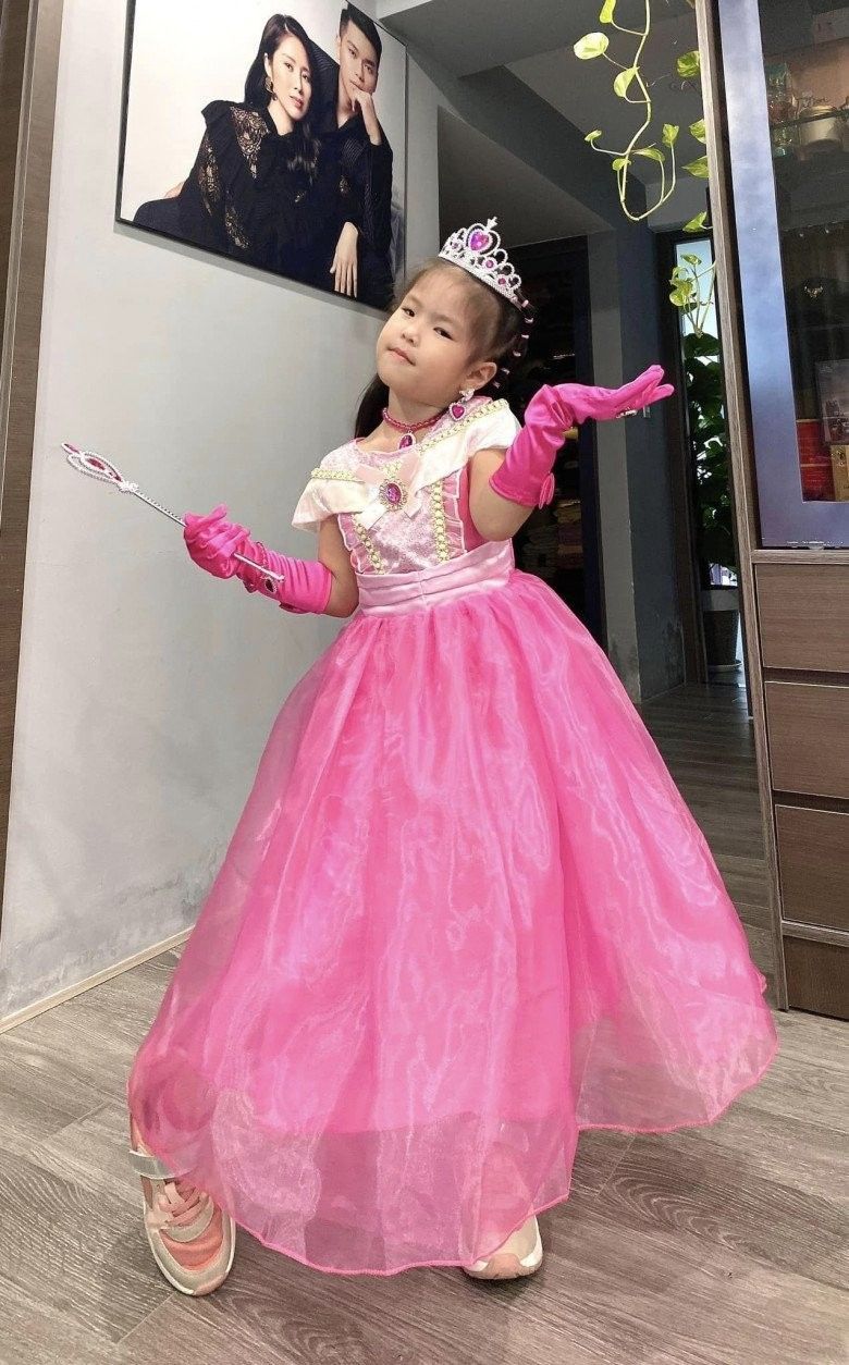 Trong những dịp đặc biệt, bà mẹ 2 con cũng đầu tư những bộ cánh lộng lẫy như công chúa cho con gái. Lê Phương cũng đầu tư các loại phụ kiện cho con, từ bao tay đến vương miện và những kiểu tóc cầu kỳ.