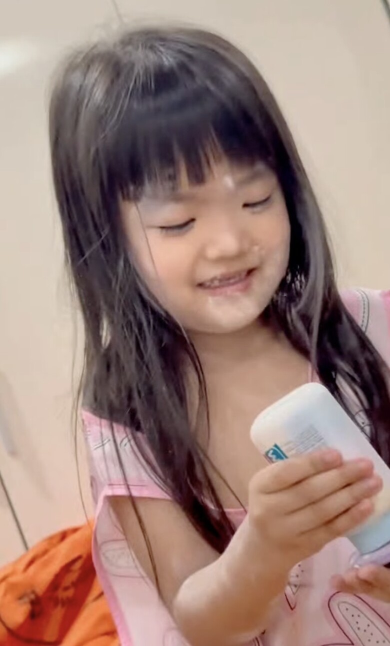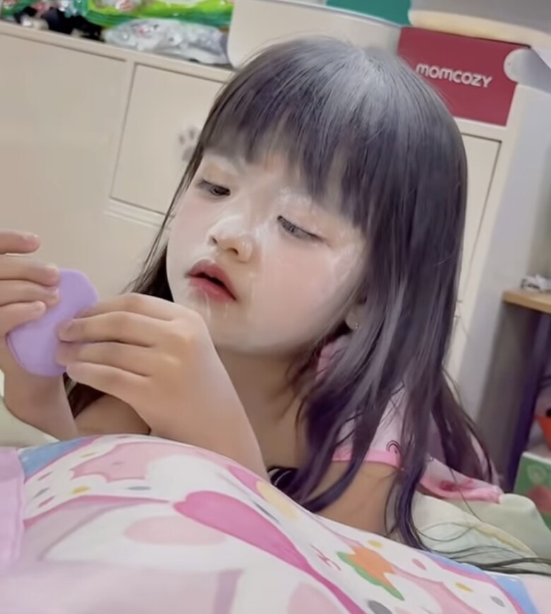 Không dừng lại ở đó, cô bé còn sử dụng mỹ phẩm của mẹ “bôi bôi, trét trét” đầy mặt trông cực kỳ hài hước. Trước độ quậy của con gái khi ở nhà với mẹ, bà xã Mạc Văn Khoa phải thốt lên “không đẻ con gái đời không nể”.
