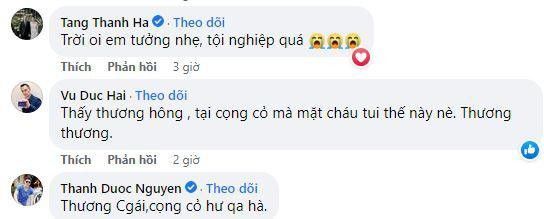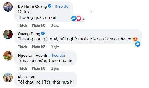 Nam ca sĩ Quãng Dũng cũng có con trai Bảo Nam, từng trải qua khoảng thời gian lo lắng vì bé hiếu động nghịch ngợm như thế nên không khỏi xót "Thương con gái quá, bôi nghệ tươi để không có bị sẹo nha em". Số khác cũng nhắc nhở bà mẹ 2 con như ca sĩ Quang Dũng, nhớ bôi nghệ cho con gái khi vết thương đã lành để không bị để lại sẹo trên gương mặt cho cô nhóc.