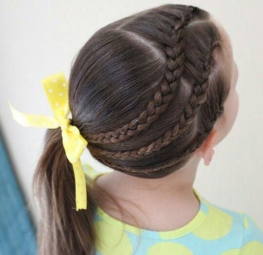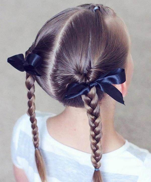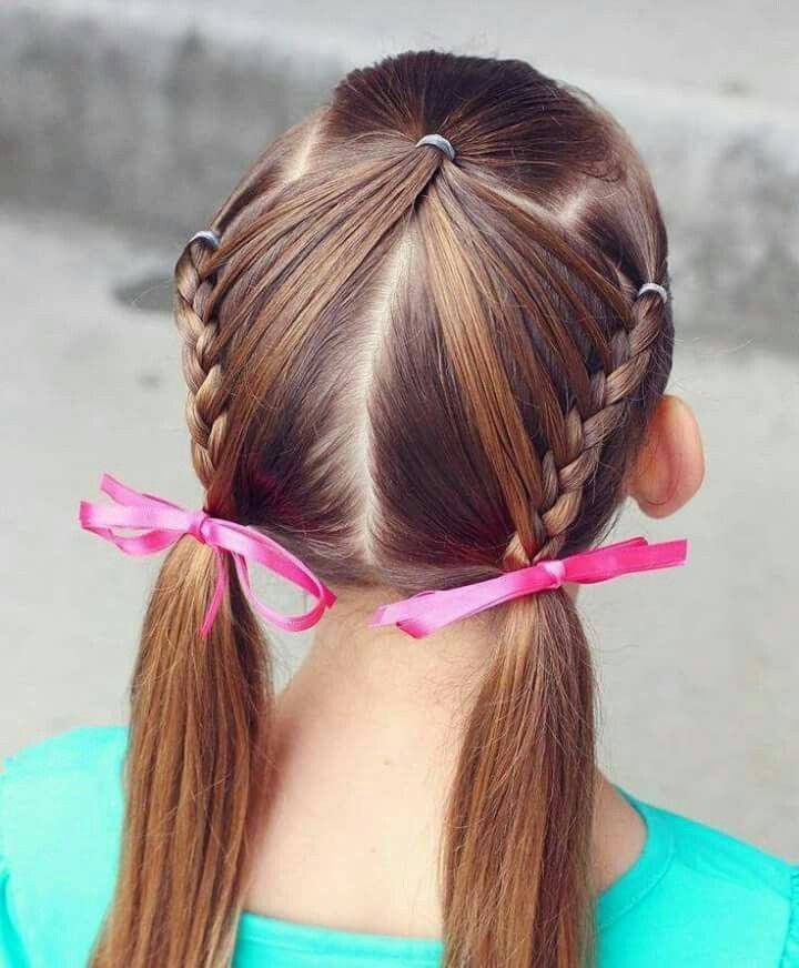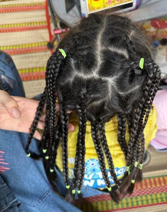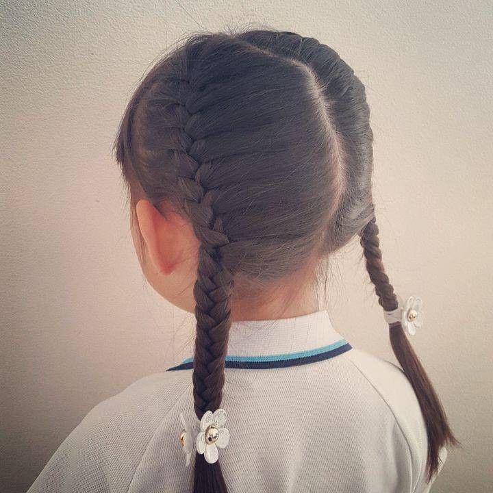 Phần tóc đỉnh đầu của bé được buộc lại và tết đuổi ở hai bên bím tóc.