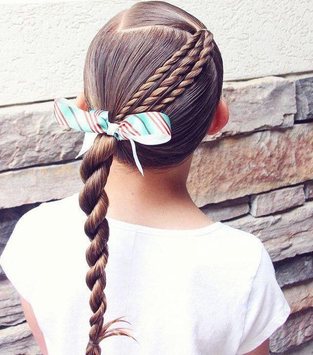 Kiểu tóc tết vát và buộc lệch 1 bên giúp bé thêm phần duyên dáng.