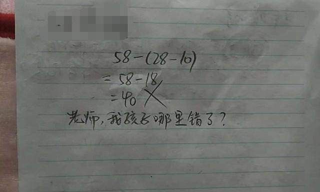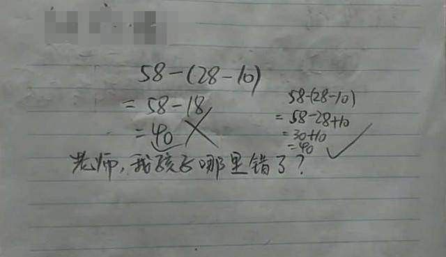 Một ngày nọ, khi đứa trẻ mang bài kiểm tra ở trên lớp về nhà và thắc mắc với mẹ về một bài toán 58-(28-10). Cậu nhóc đã hoàn thành bài toán một cách tỉ mỉ và cho kết quả rằng 40. Thế nhưng thật bất ngờ cô giáo đã gạch sai đáp án này. Chị đã phải cẩn thận tính lại vẫn thấy đúng là kết quả trên nhưng không hiểu sao cô giáo lại gạch đi. Có thể cô giáo đã gạch nhầm chăng?