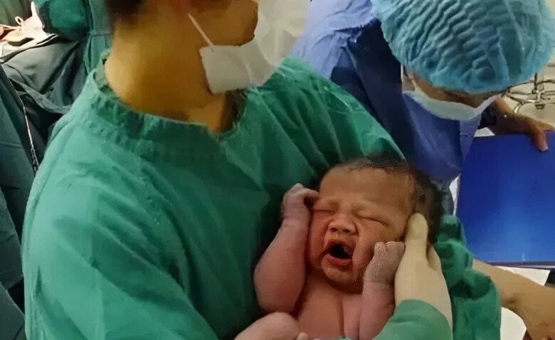 Em bé khoẻ mạnh, khóc to khi được đưa ra khỏi màng ối.