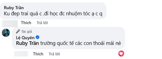 Chính vì thế, người này tỏ ra thắc mắc khi con trai Lệ Quyên lại có thể nhuộm tóc bạch kim để đi học. "Bo đẹp trai quá chị, đi học được nhuộm tóc à chị Quyên?".