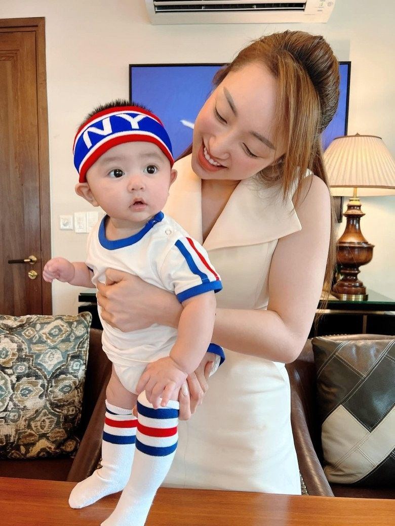 Vợ Chi Bảo cho rằng, cô luôn vui vẻ, tích cực và sinh hoạt khoa học trong quá trình mang thai nên con trai cũng có tính cách dễ chịu. "Soái ca nhí" rất hợp tác với mẹ mỗi dịp 2 mẹ con lên đồ đôi.