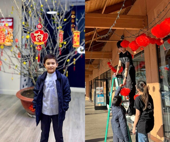 Mới đây, vợ cũ Đan Trường đã chia sẻ hình ảnh cô cùng quý tử trang trí cơ ngơi tại Mỹ để chuẩn bị đón Tết Nguyên đán. Nữ doanh nhân còn gọi con trai 7 tuổi là CEO vì sở hữu một cửa hàng bán cà phê, bánh ngọt. Đây là món quà mà Thủy Tiên dành tặng con trai. Không gian nhà hàng được trưng bày rất nhiều hoa mai và đào, treo đèn lồng đỏ, câu đối xuân,...