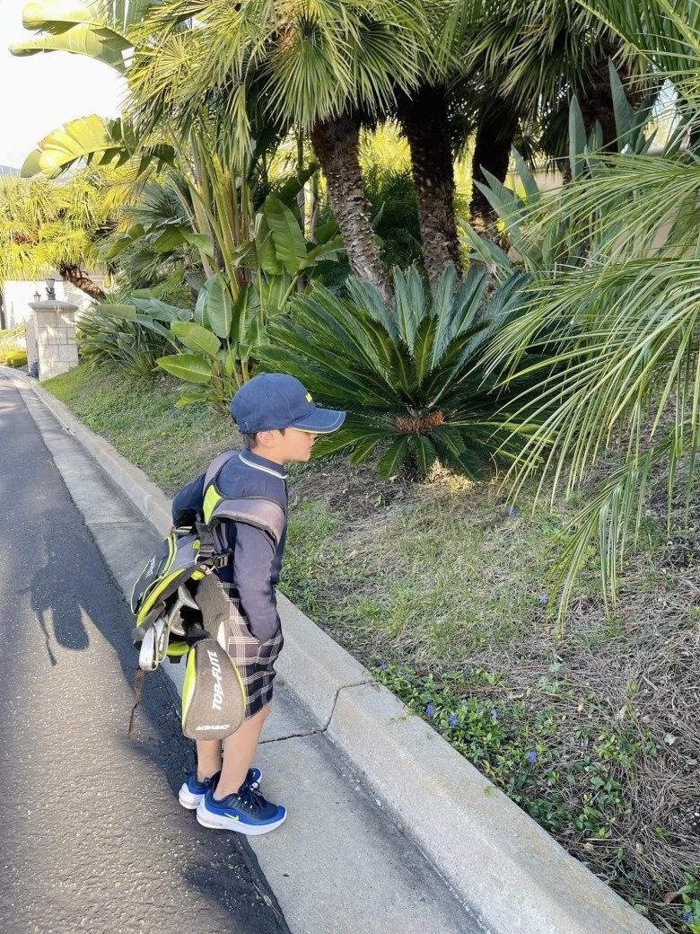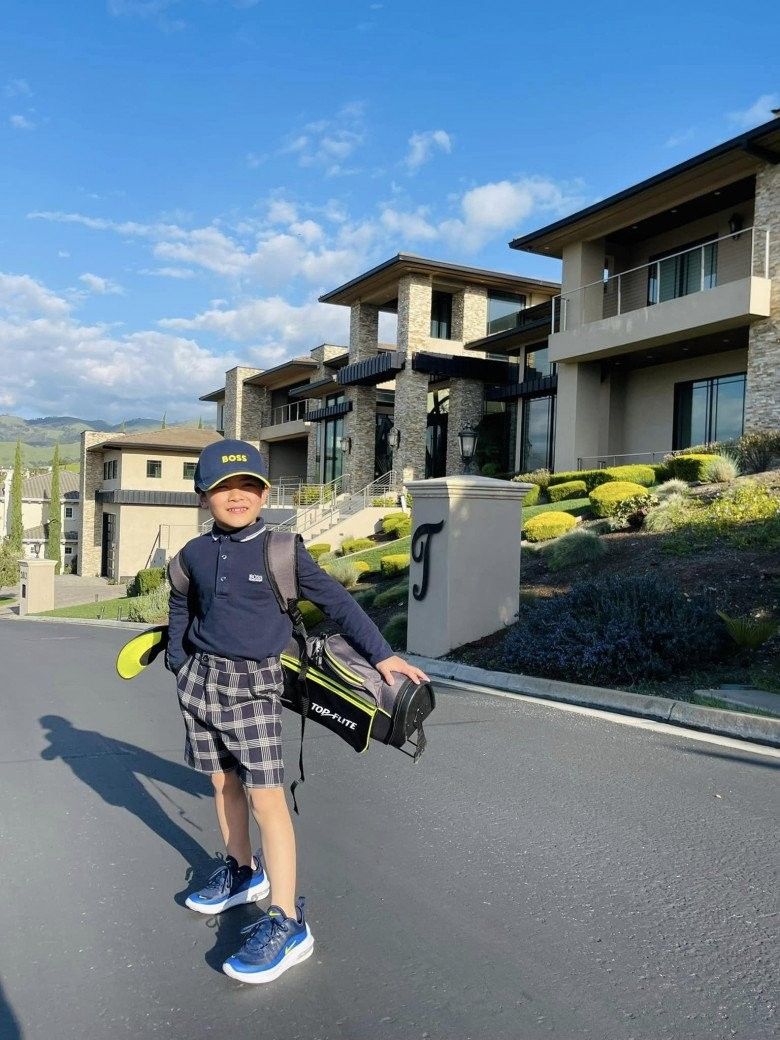 "Bé hạt tiêu" nhưng Thiên Từ đã tỏ ra rất người lớn khi tự mình xách cả balo nặng trĩu gậy golf trên vai. Cộng với thần thái của con siêu sao nổi tiếng, rich-kid biến dinh thự 4000m2 của mình ở đằng sau trở nên phông bạt mờ nhạt.