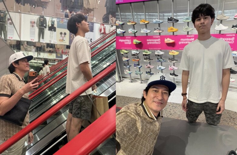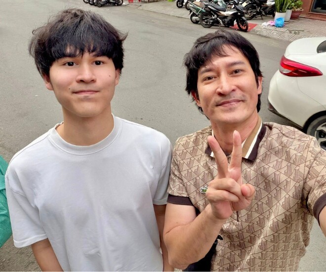 Đứng cạnh bố, con trai Huy Khánh giờ đây ra dáng thanh niên trưởng thành ở tuổi 19. Kiến Bách có chiều cao "khủng" trên 1m8. Cách đây 2 năm, anh chàng đã "bỏ xa" bố lẫn mẹ.