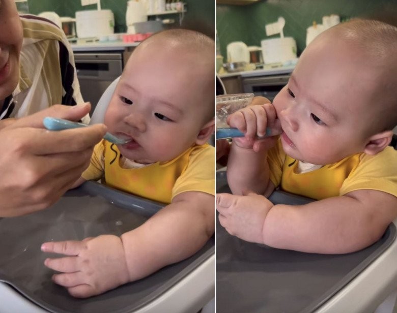 Con trai Lê Âu Ngân Anh tập ăn dặm khi tròn 6 tháng tuổi.