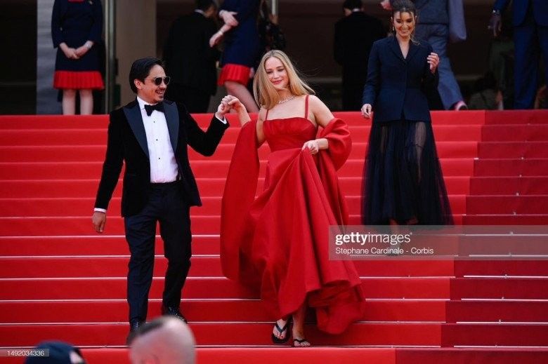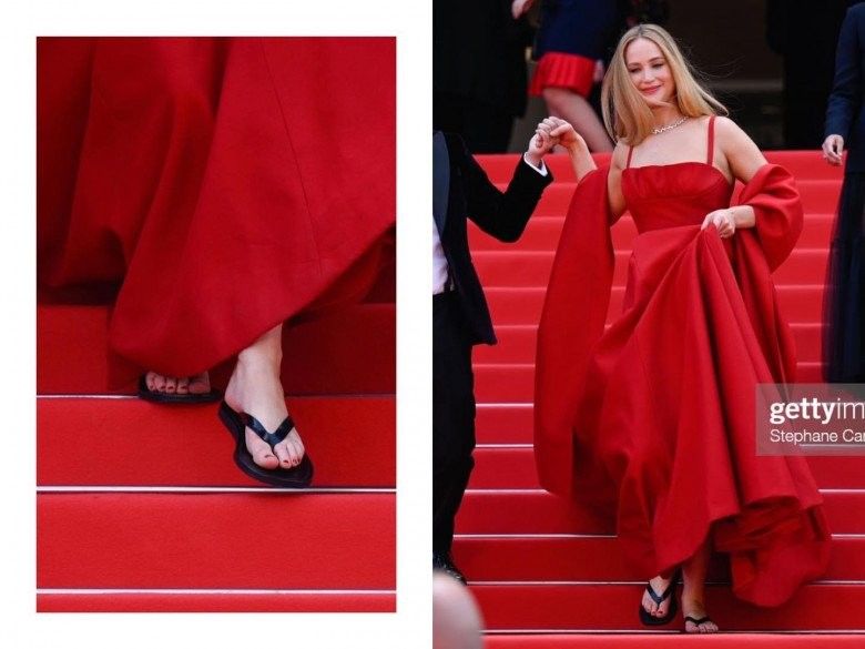 Mới đây, minh tinh màn bạc Jennifer Lawrence có màn xuất hiện đẹp như tiên nữ với chiếc váy màu đỏ được làm riêng của nhà mốt Dior. Tuy nhiên, ngôi sao hàng đầu lại nói không với giày cao gót. Thay vào đó, cô chọn dép tông cao su để được thoải mái di chuyển trên những bậc thang của thảm đỏ Cannes. Sự lựa chọn này trái với quy định của liên hoan phim, khi tất cả khách mời nữ buộc phải mang giày cao gót lên thảm đỏ để thể hiện sự trang trọng.