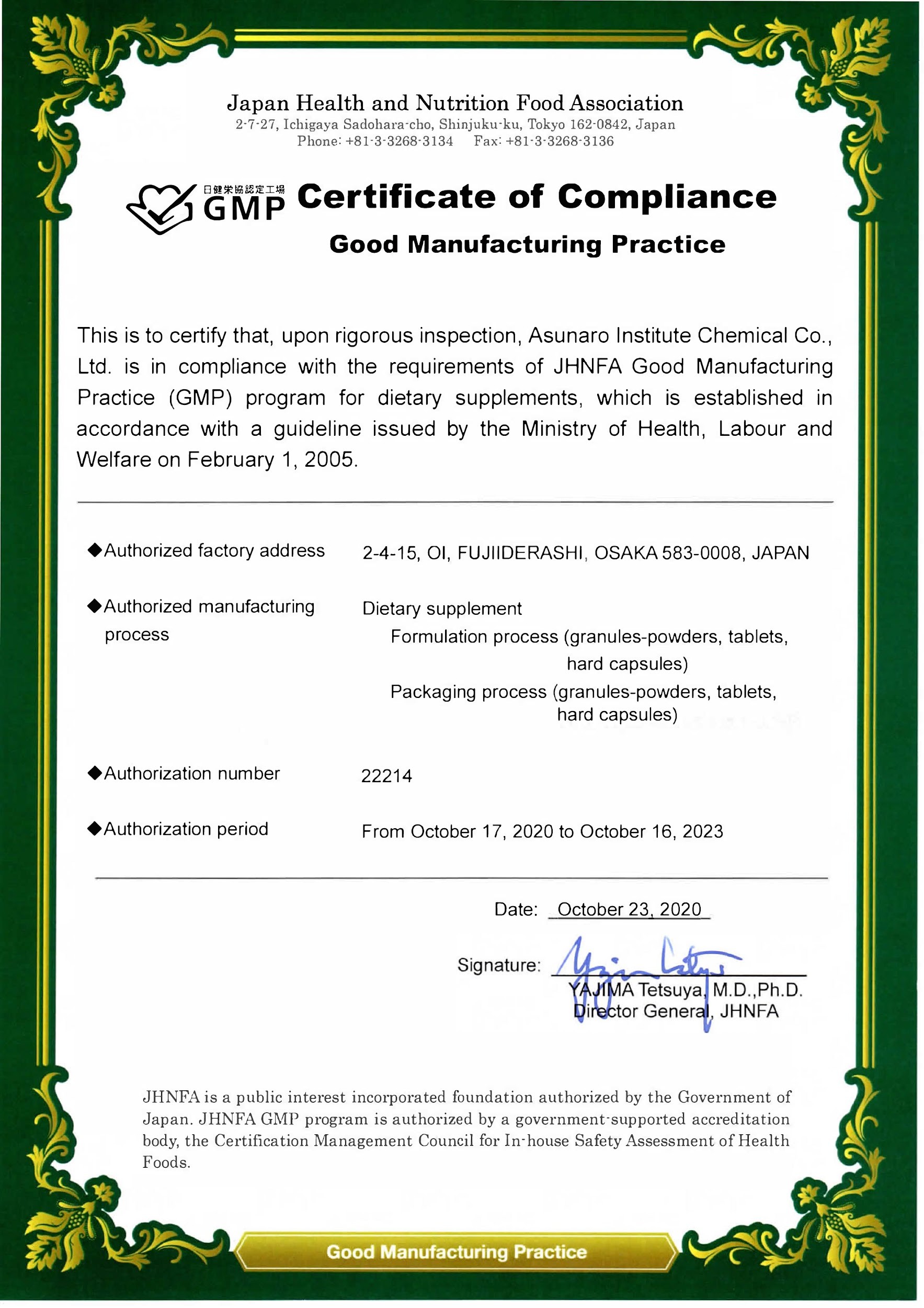 Giấy chứng nhận đạt chuẩn GMP của nhà máy sản xuất Sakirei tại Nhật Bản.