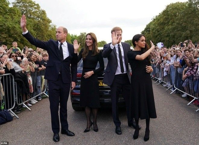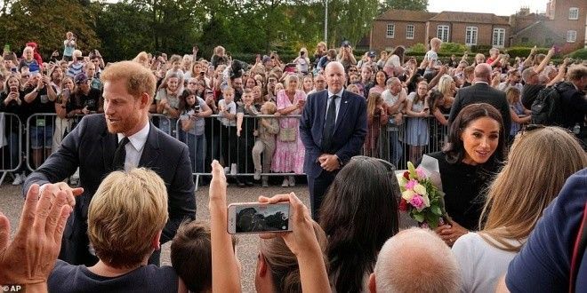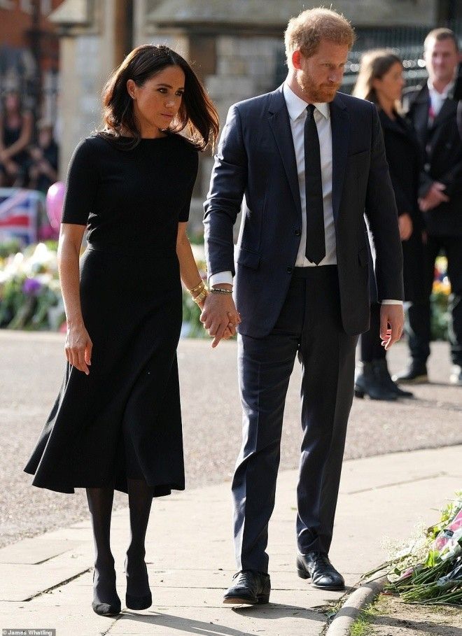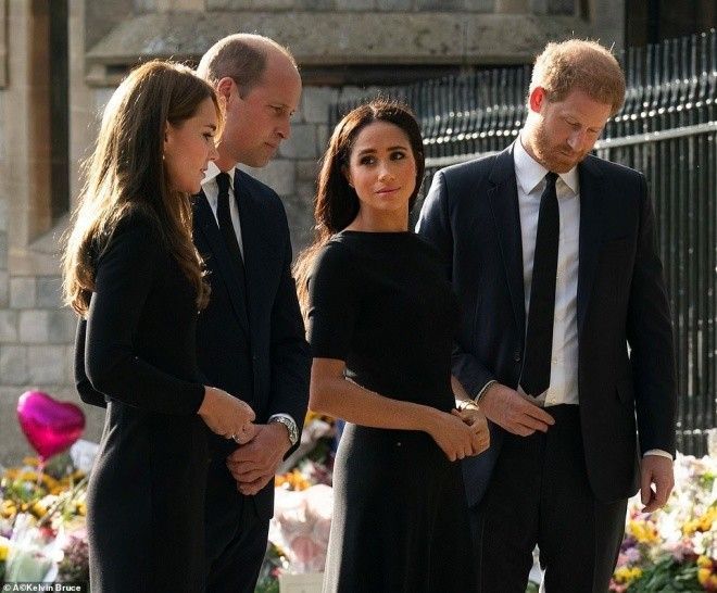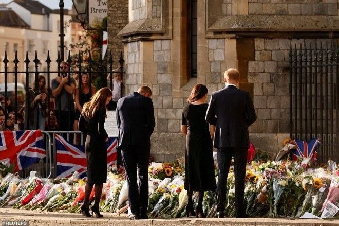 Được biết, bộ tứ hoàng gia đã cùng ngắm nhìn những bó hoa, những tấm thiệp cùng với lời nhắn của người dân được đặt quanh tường rào lâu đài gửi đến Nữ hoàng Elizabeth. Trong thời khắc đọc những lời nhắn, Harry nắm chặt tay vợ và khá xúc động. Trong khi đó, Meghan choàng tay ôm và an ủi chồng.