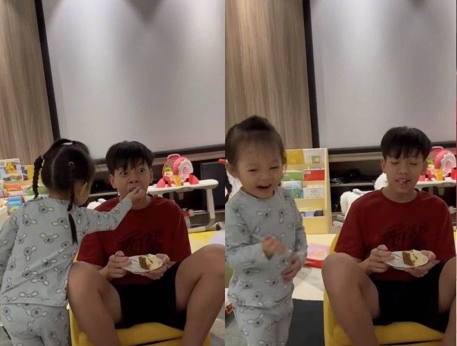 Sau đó, cả nhà Cường Đô La cùng quây quần bên chiếc bánh kem. Suchin rất hào hứng, hăng hái "phụ" bố thổi nến. Cô bé còn đáng yêu hết cỡ khi múc từng muỗng bánh đút cho bố và anh trai. Được Suchin đút bánh, Subeo cũng nhiệt tình há miệng thật to để ăn khiến em gái cười khoái chí. Dù không xuất hiện trong video, thế nhưng nhiều người ngầm hiểu nhân vật cầm máy quay ghi lại những khoảnh khắc hạnh phúc này hẳn là Đàm Thu Trang.