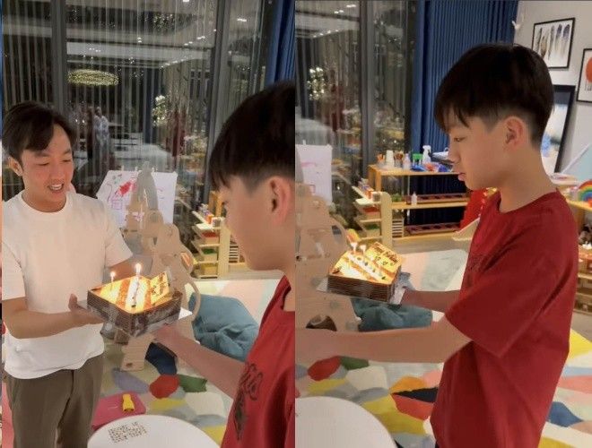 Trong video, "anh cả" Subeo thực hiện nhiệm vụ cắm nến, đốt lửa rồi bê bánh kem tặng bố. Cường Đô La và Suchin vừa ngồi đợi, vừa vỗ tay chúc mừng sinh nhật. Nhận bánh từ tay con trai, "đại gia phố núi" hạnh phúc ôm hôn quý tử.