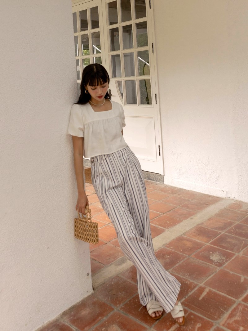 Quần kẻ sọc mảnh tạo hiệu ứng chân dài, giúp tổng thể nổi bật nhẹ nhàng. Tông màu trung tính dễ kết hợp áo trơn, phù hợp dạo phố ngày Tết.
