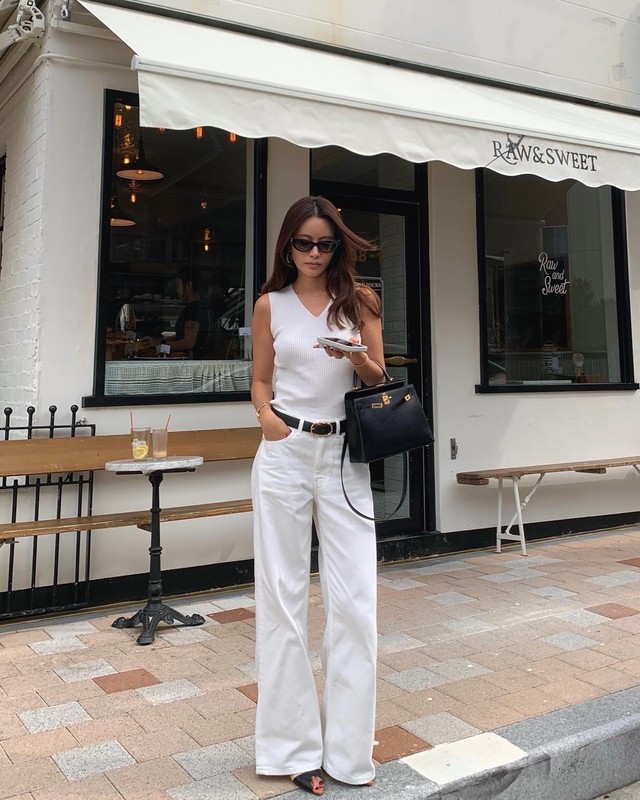 Quần trắng đặc biệt phù hợp với những buổi chụp hình du xuân vì bắt sáng tốt, giúp tổng thể trông "xịn" hơn trên ảnh. Chỉ cần giữ phụ kiện tối giản, bạn đã có ngay set đồ vừa sang vừa trẻ trung.