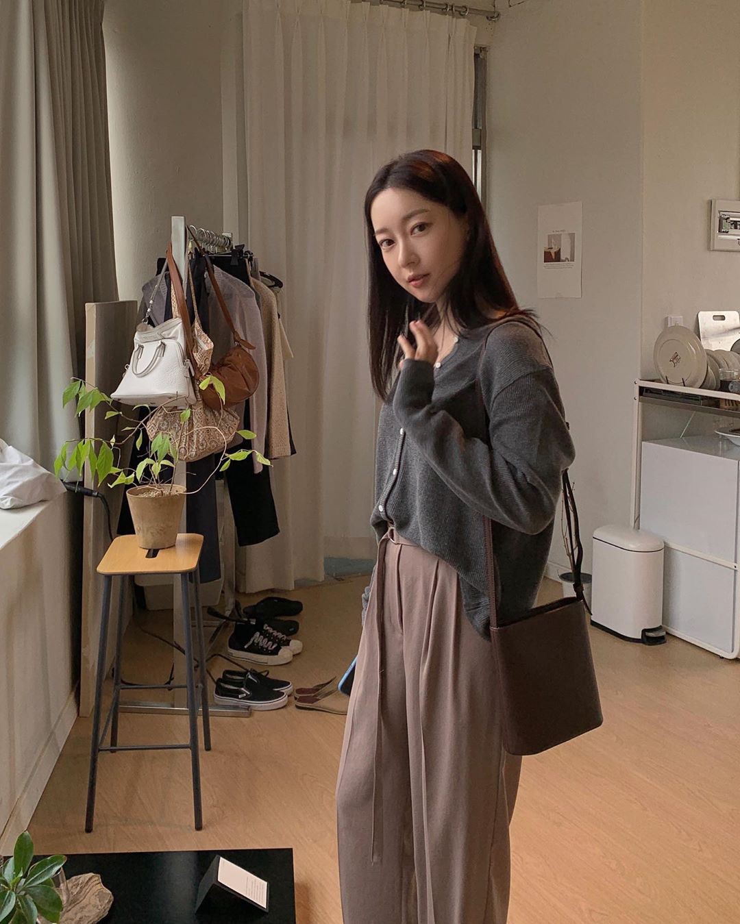 Quần nâu tạo cảm giác ấm áp, sang trọng. Tông màu này dễ phối áo trắng, kem hoặc hồng nhạt, giúp tổng thể hài hòa và hiện đại dịp Tết.