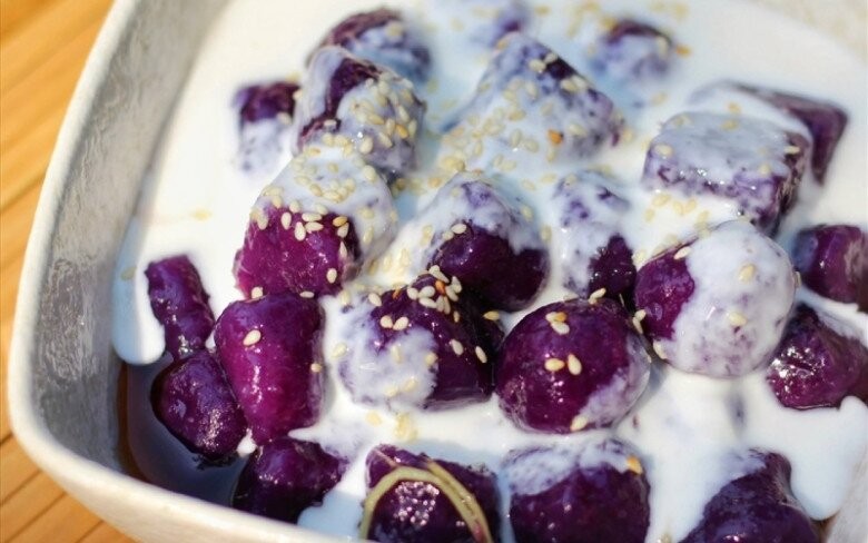 Từ khoai môn tím có thể chế biến thành nhiều món ăn phong phú, hấp dẫn. Phổ biến nhất là canh khoai môn nấu xương, nấu sườn hoặc nấu tôm; các món ngọt như chè khoai môn, khoai môn nấu nước cốt dừa; khoai môn chiên, khoai môn lệ phố. Ngoài ra, khoai còn được dùng làm nhân bánh trung thu, bánh bao, nấu lẩu hoặc kho cùng thịt, cá, góp phần làm phong phú thêm bữa ăn gia đình.
