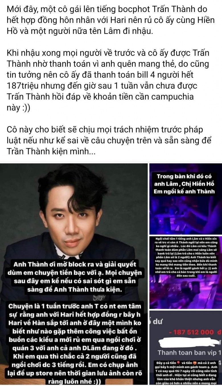 Nói thêm về sự việc, trước đó, vào sáng 26/4, mạng xã hội xôn xao thông tin được cho là xuất phát từ một cô gái có lượng theo dõi "khủng" trên Instagram. Theo đó, người này đăng tải bài viết "bóc phốt" nêu đích danh Trấn Thành, cho biết mới đây đã cùng nam MC và hội bạn của anh đi bar chơi. Sau cuộc vui, cô nhận được lời đề nghị nhờ thanh toán hóa đơn hơn 187 triệu đồng, thế nhưng đến nay vẫn chưa được trả tiền.