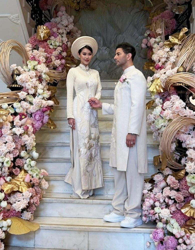 Tiên Nguyễn và chồng - doanh nhân Justin Cohen diện áo dài truyền thống trong lễ rước dâu.