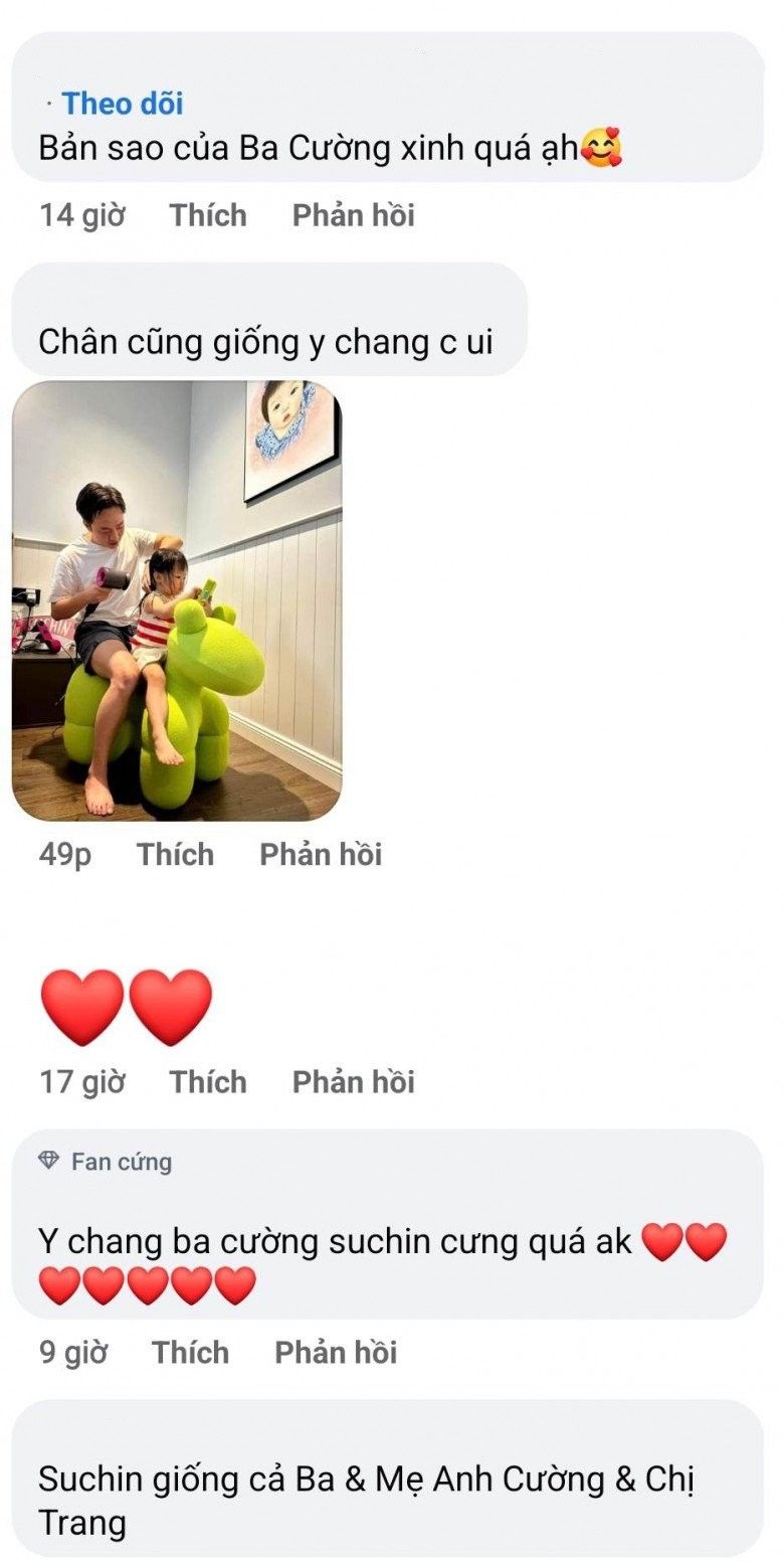 Bài viết của Đàm Thu Trang nhanh chóng thu hút nhiều lượt tương tác vì khiến người xem cảm thấy thích thú. Hầu hết bình luận đồng tình với nhận xét của cựu mẫu xứ Lạng về chuyện Suchin là "bản sao" của Cường Đô La: "Y đúc bố Cường", "Môi cong veo của ba, khuôn mặt cũng của ba luôn", "Giống ba như 2 anh em sinh đôi",... Thậm chí, có tài khoản còn so sánh chân của 2 bố con: "Chân cũng giống y chang chị ơi".