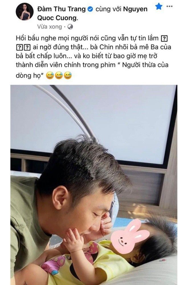 "Hồi bầu nghe mọi người nói cũng vẫn tự tin lắm. Ai ngờ đúng thật. Bà Chin nhõi mê ba của bà bất chấp luôn. Đã giống nhau mà còn mê nhau. Và không biết từ bao giờ mẹ trở thành diễn viên chính trong bộ phim 'Người thừa của dòng họ'", Đàm Thu Trang từng chia sẻ.