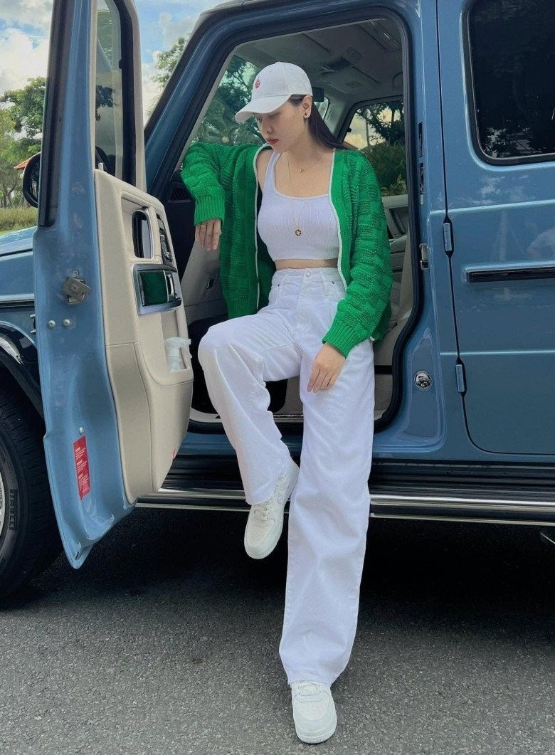 Ra phố với cây đồ trắng gồm quần jeans ống suông phối cùng croptop, Đàm Thu Trang khéo khoe chân dài miên man cùng vòng eo bé xíu. Khoác thêm chiếc áo cardigan xanh lá bên ngoài, nàng cựu mẫu lại thêm muôn phần nổi bật.