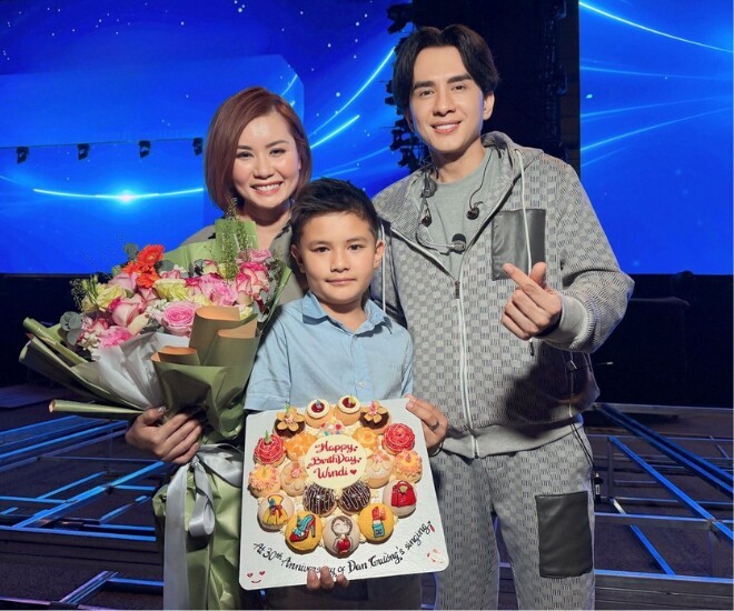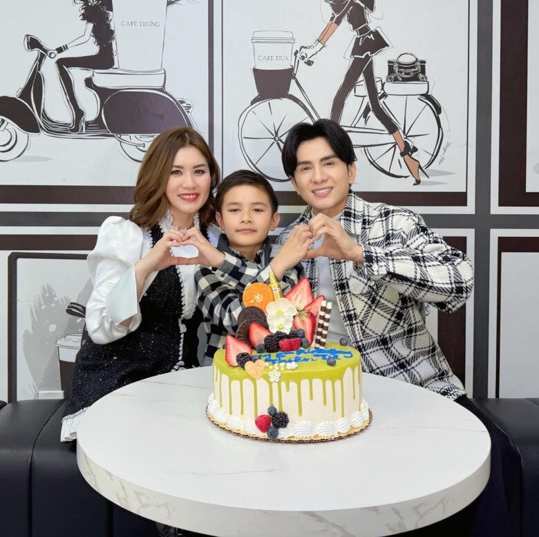 Kèm theo đó, Đan Trường đăng tải khoảnh khắc hội ngộ bên vợ cũ. Bé Thiên Từ - con trai của cặp đôi là người cầm bánh kem cho mẹ.