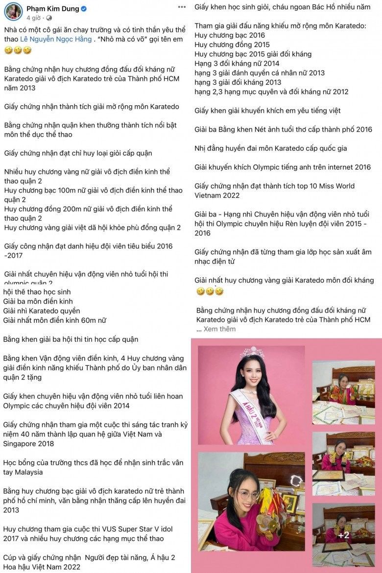 Mới đây, "bà trùm hoa hậu" Phạm Kim Dung vừa có bài đăng liệt kê thành tích học tập lẫn thể thao mà cô gái sinh năm 2003 đạt được liền nhận được hơn 11,3K lượt tương tác cùng hàng chục lượt chia sẻ, hàng trăm lời bình khen ngợi.